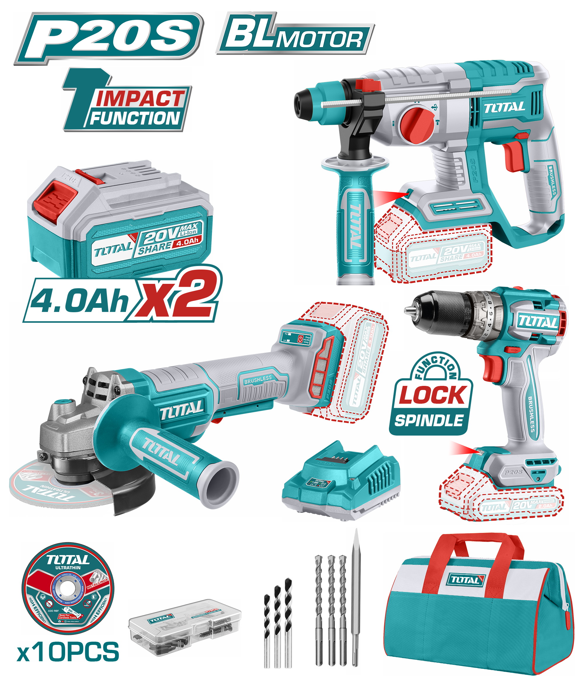 TOTAL ΕΠΑΓΓ. ΣΕΤ ΠΝΕΥΜΑΤΙΚΟ ΠΙΣΤΟΛΕΤΟ + ΔΡΑΠ/ΒΙΔΟ ΚΡΟΥΣΤ. + ΓΩΝΙΑΚΟΣ ΤΡΟΧΟΣ ΜΠΑΤ. Li-ion 20V / 4Ah / 2 ΜΠΑΤ (TOSLI240202)